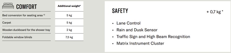 When buying a motorhome, camper van or urban vehicle (hereafter: motorhome), it is particularly important to choose the right layout and an appealing design. In addition, weight also plays an essential role. Family, friends, optional equipment, accessories and baggage ? space must be available for all of these. At the same time, there are legal and technical limits to the configuration and load. Every motorhome is designed for a certain weight, which may not be exceeded during driving. For motorhome buyers, this raises the question: How should I configure my vehicle to accommodate passengers, baggage and accessories according to my needs without the vehicle exceeding this maximum weight? In order to make this decision easier for you, we provide you below with a few tips that are particularly important when selecting your vehicle from our portfolio: